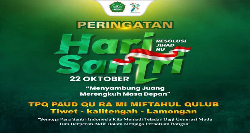 Pada tanggal 22 Oktober 2024, Madrasah Ibtidaiyah Miftahul Qulub merayakan Hari Santri Nasional 2024 dengan semarak. Kegiatan ini dihadiri oleh Ketua Pengurus, anggota Komite, seluruh guru dari TPQ, PAUDQU, RA, dan MI, serta wali murid. Peringatan ini bukan hanya sekadar acara, tetapi juga menjadi momen penting untuk mengenang perjuangan santri dalam sejarah bangsa, khususnya dalam Resolusi Jihad.